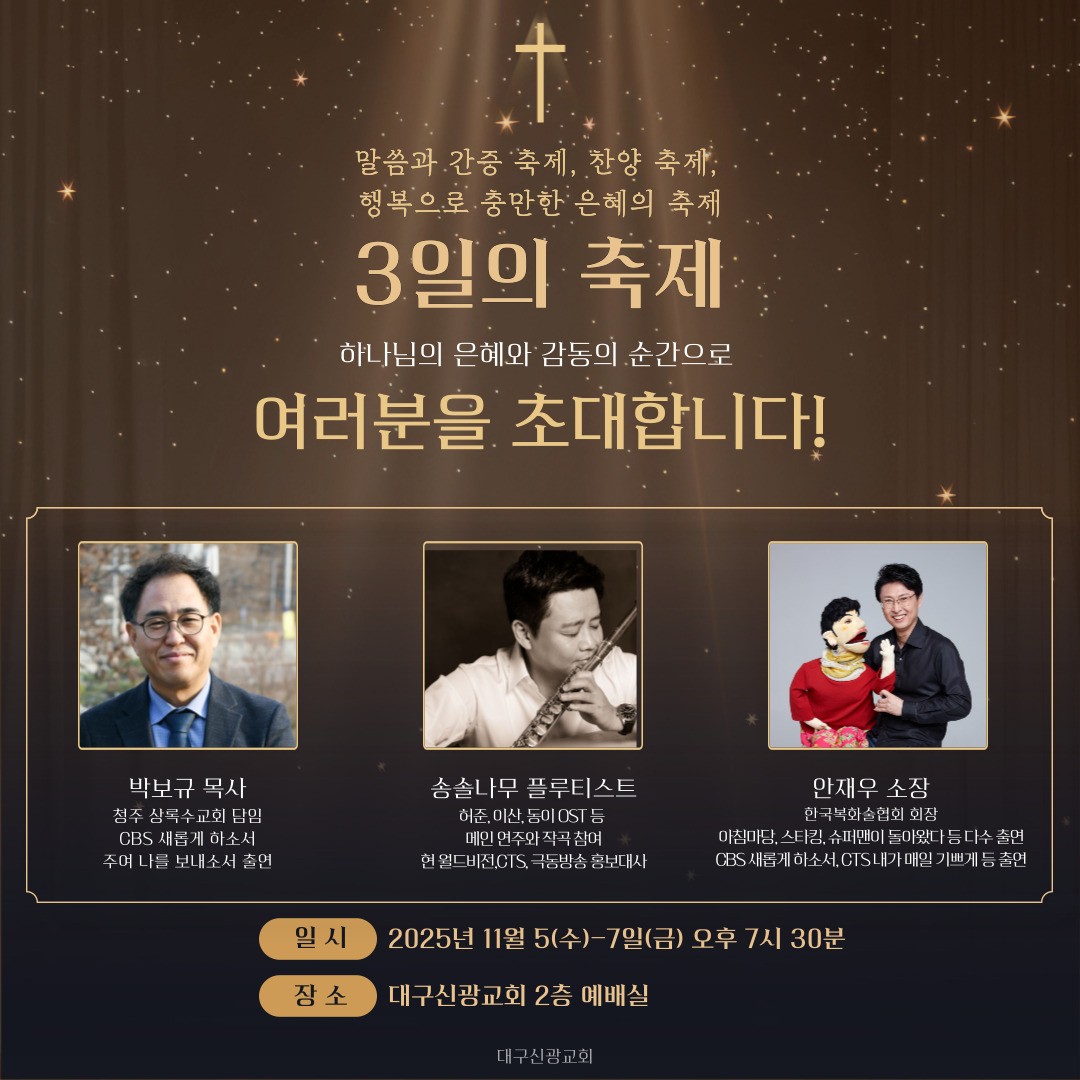 3ÀÏÀÇ ÃàÁ¦ ¾È³»µå¸³´Ï´Ù. ´ë±¸½Å±¤±³È¸ ¼ºµµ´Ô°ú Àüµµ´ë»óÀÚ¿Í Áö¿ªÁÖ¹ÎÀÌ ÇÔ²²ÇÏ´Â Âù¾ç°ú °£Áõ ±×¸®°í ¸»¾¸ÀÇ ÀºÇý°¡ ÀÖ´Â ½Ã°£ÀÌ µÇ±æ ¼Ò¸ÁÇÕ´Ï´Ù. ∙ÀϽà : 11¿ù 5ÀÏ(¼ö) ~ 7ÀÏ(±Ý) Àú³á 7½Ã 30ºÐ. 2Ãþ ¿¹¹è½Ç ∙°»ç : 5ÀÏ(¼ö) ¹Úº¸±Ô ¸ñ»ç(ûÁÖ »ó·Ï¼ö±³È¸ ´ãÀÓ, CBS »õ·Ó°Ô ÇϼҼ, ÁÖ¿© ³ª...