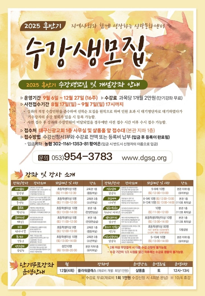 ∙Á¢¼ö¹æ¹ý : ¼ö°½Åû¼ 1ºÎ¿Í Çб⺰ ¼ö°·á Àü¾× ¶Ç´Â µî·Ïºñ ³³ºÎ(´ë±¸½Å±¤±³È¸ »ç¹«½Ç ¹× ¼£·ÒȦ Á¢¼ö´ë ½Åû)